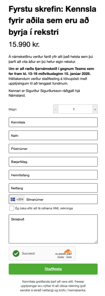 Fyrir námskeið/viðburð og magn meira en 1, þá koma auka reitir fyrir lista yfir þátttakendur.