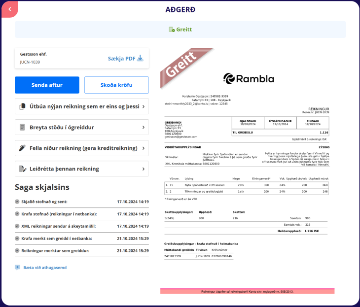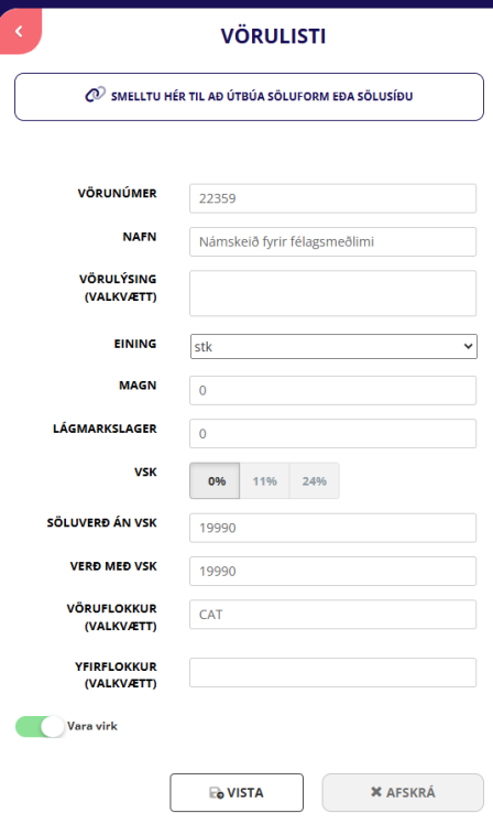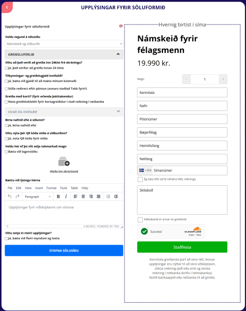 Til að getað stofnað sölusíðu þarftu að vera í greiddri áskrift að Konto. Almennt er hagkvæmast að vera FRÆ áskrift, 2.290 kr. ( + vsk) á mánuði eða 22.900 (+ vsk) fyrir ársáskrift og kaupa síðan inneign fyrir reikningagerð eftir því hvað þú þarft að gefa út marga reikninga. Því fleiri inneignir sem eru keyptar í einu því lægra er stykkjaverðið. Þinn kostnaður við að senda reikning í netbanka (kröfu) er 160 kr. Þú hefur val um að setja tilkynningar- og greiðslugjald á reikninga til að mæta þínum kostnaði.